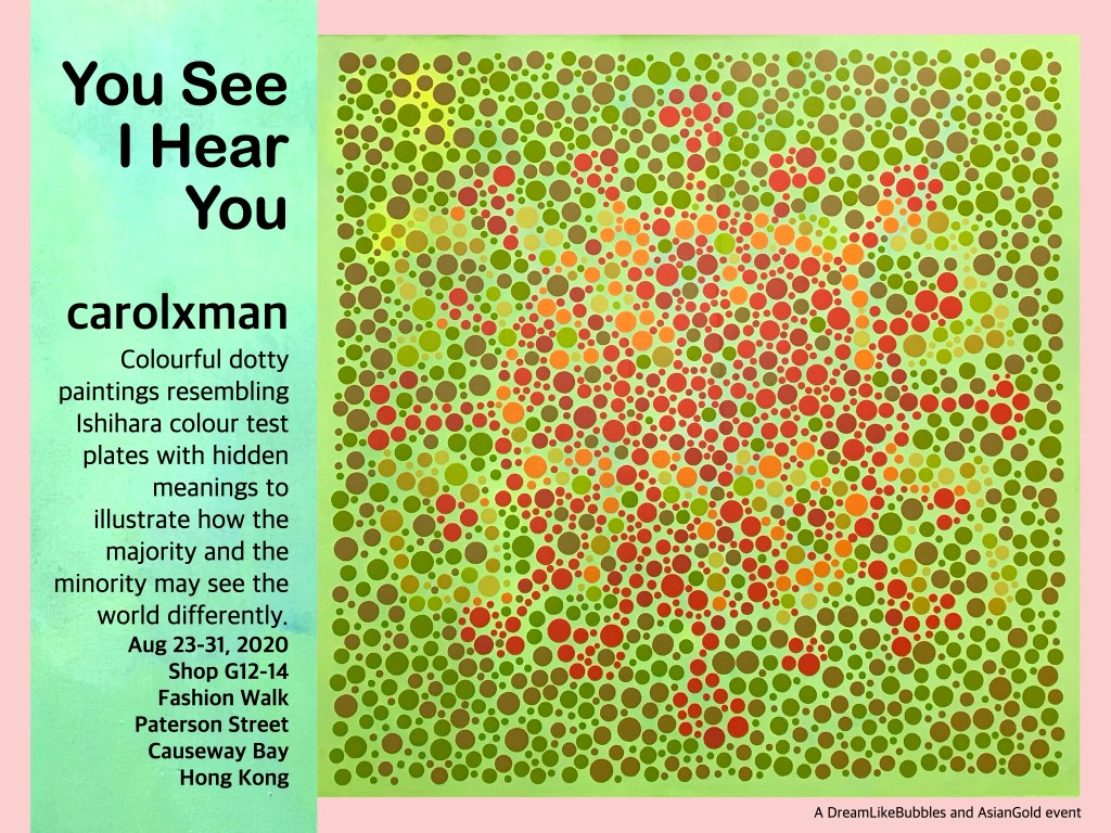 Based on the research I’ve conducted into color blindness, I took to creating my own colour vision plates, differing from the original Ishihara plates, by challenging what people cannot see. My works have hidden images and messages only visible to an audience with red-green deficiency. While the majority of us rejoice over our ability to see the objects in a colour-blind plates, we still depend on the minority within our communities to tell us what exists outside of our “normal” vision.