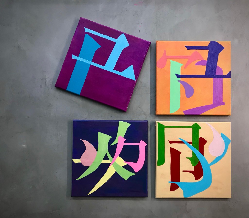 These characters are created by rendering the alphabets of Hebrew names in Songti, and using the colour layers to indicate the spelling order of the word. For instance, the painting with purple background consists of two Hebrew letters, ב and ן, as ב covers part of ן, it spells בן. These paintings are dedicated to בנימין יצחק בן מאיר (Benjamin Isaac Ben Meir).