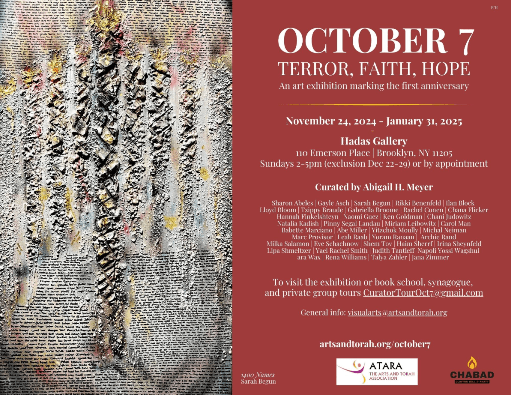 “October 7: Terror, Faith, Hope” is a visual arts initiative to mark the one year anniversary of the most tragic and deadliest day for Jews since the Holocaust